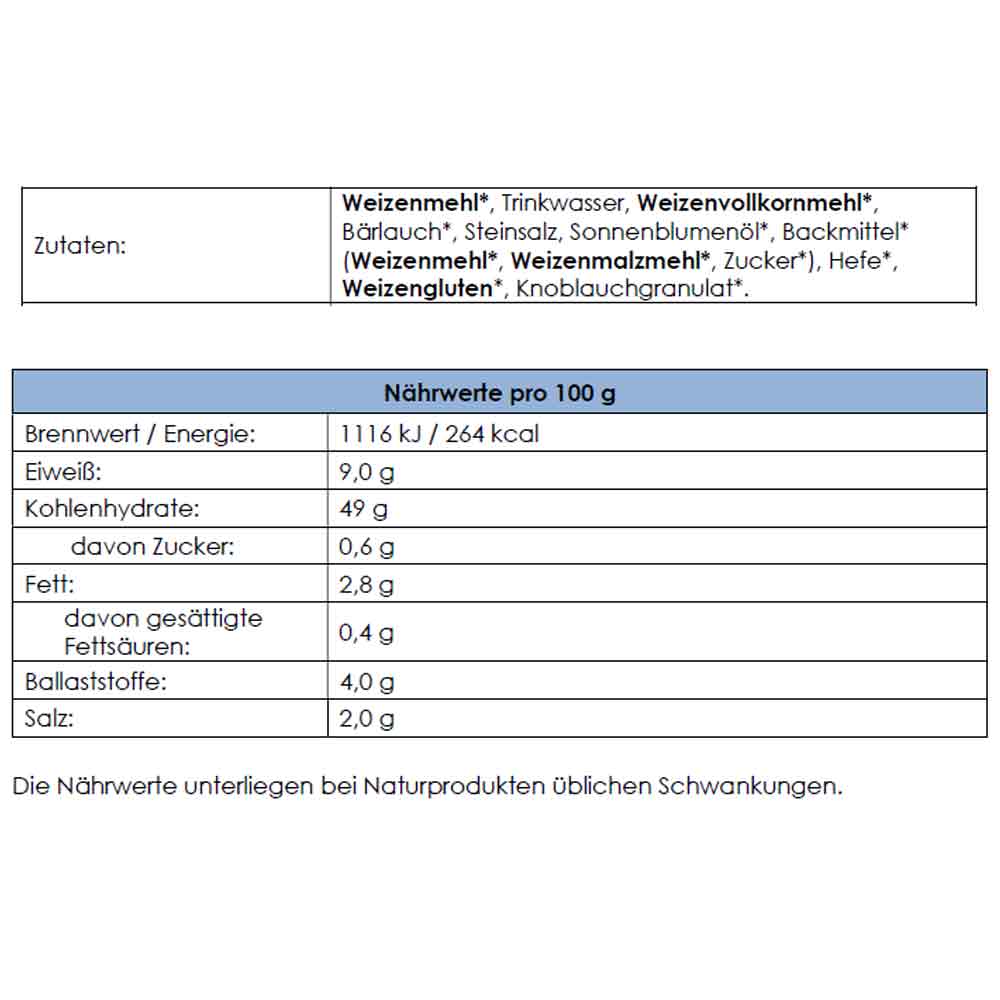 WEIZENMEHL*, Trinkwasser, WEIZENVOLLKORNMEHL*, Bärlauch, Steinsalz, SONNENBLUMENÖL*, BACKMITTEL* (WEIZENMEHL*, WEIZENMALZMEHL*, Zucker*) Hefe*, WEIZENGLUTEN*, Knoblauchgranulat*
