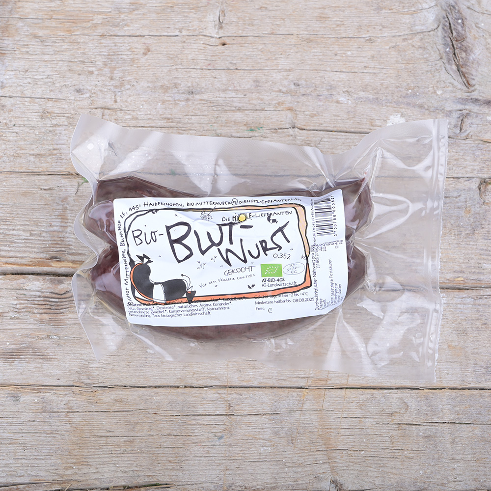 Die Blutwurst ist eine klassische Kochwurst, welche aus Schweinefleisch, Speck, Gewürzen und Blut hergestellt wird. Am besten mit Sauerkraut genießen.
