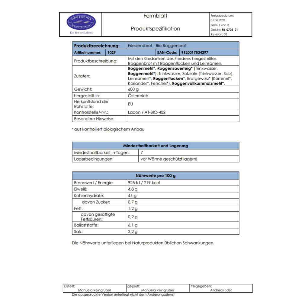 Das Friedensbrot ist ein aromatisches und saftiges Roggenbrot mit Roggenflocken & Leinsamen - es ist nur an bestimmten Feiertagswochen im Jahr verfügbar
