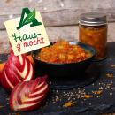 Das Hausg'mocht Chutney Karotten Apfel Ingwer hat eine fruchtig-süße Note und eine feine Schärfe. Passt perfekt zu Käse oder Brot.