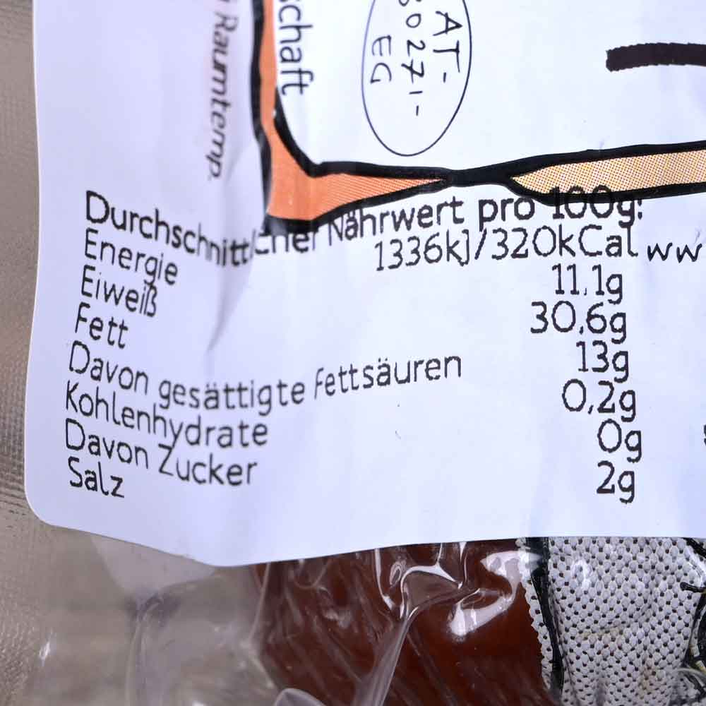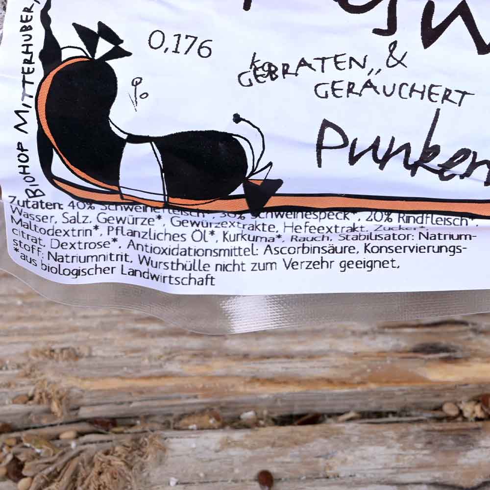 Schweinefleisch*, Wasser, Ursalz*, Rindfleisch*, Hefeextrakt+, Zucker*, Gewürze*, Maltodextrin*, Kurkuma*, Stabilisator, Dextrose* Konservierungsmittel