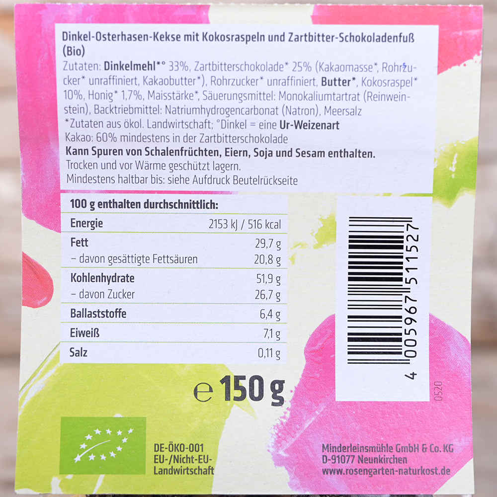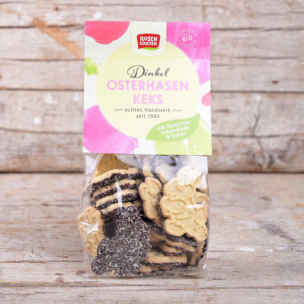 Die knusprigen Dinkel-Osterhasenkekse werden in feine Zartbitterschokolade getaucht & mit Kokosstreuseln verfeinert - dank ihrer Form bei Klein & Groß beliebt