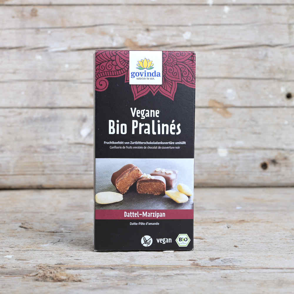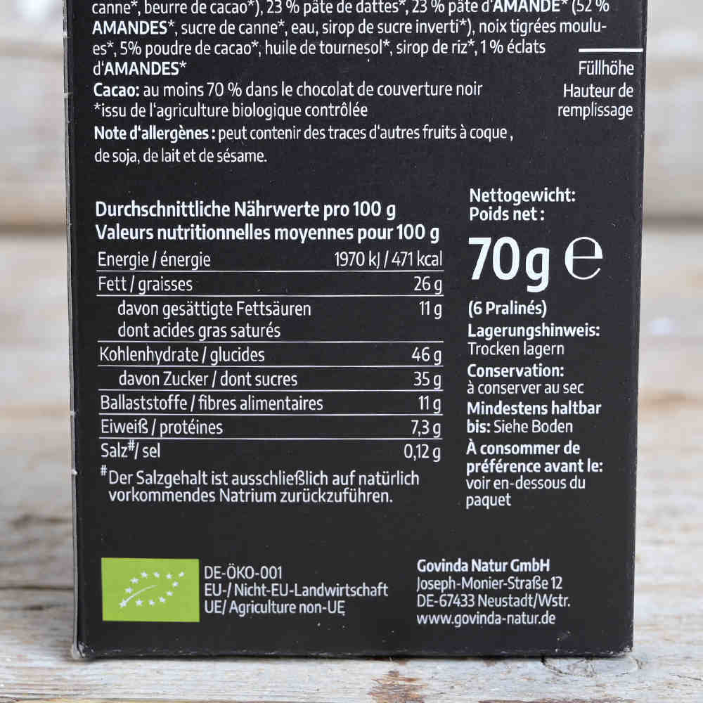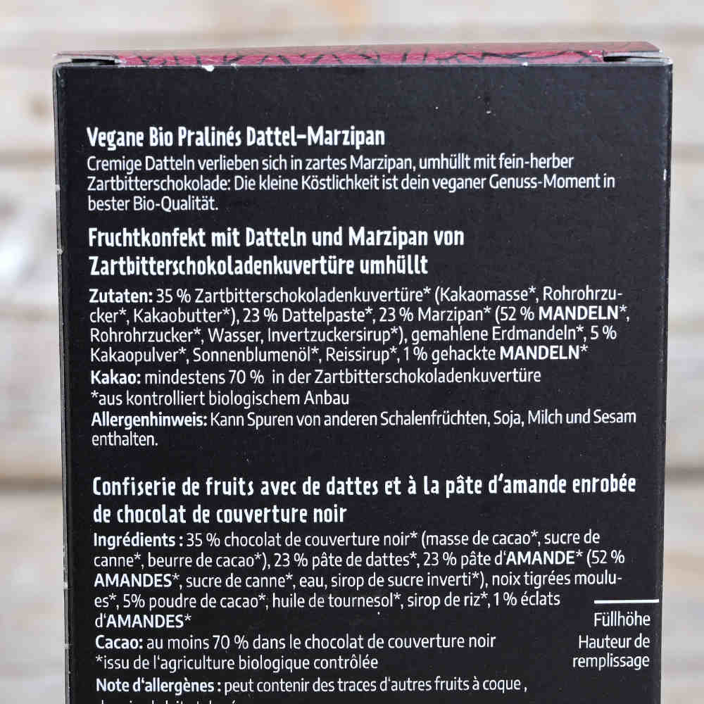 Die fruchtig süßen Pralinen Dattel Marzipan sind umhüllt mit fein-herber Zartbitterschokolade.