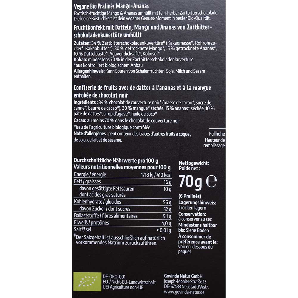 Die fruchtig süßen Pralinen Mango Ananas sind umhüllt mit fein-herber Zartbitterschokolade.