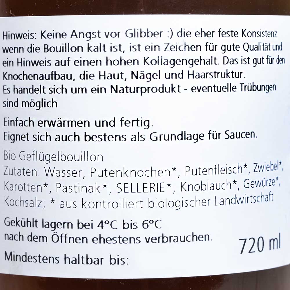 Die Pute Kraftbrühe ist reich an wichtigen Inhaltsstoffen wie Kollagen, Mineralstoffen und Protein.