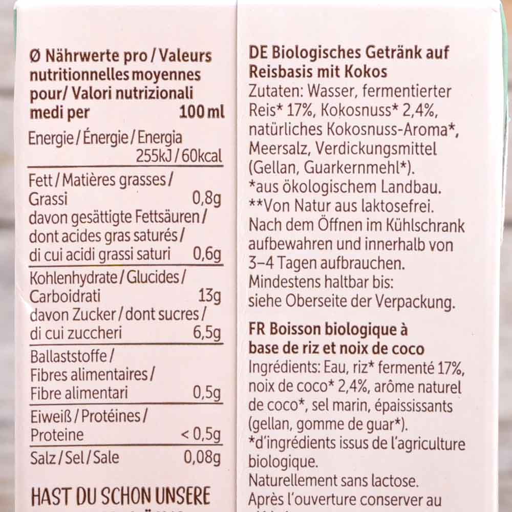 Der exotische Reis Kokos Drink ist ein Mix aus sonnenverwöhnten Kokosnüssen und ungesüßtem Reis – zum puren Genießen oder im köstlichen Shake.