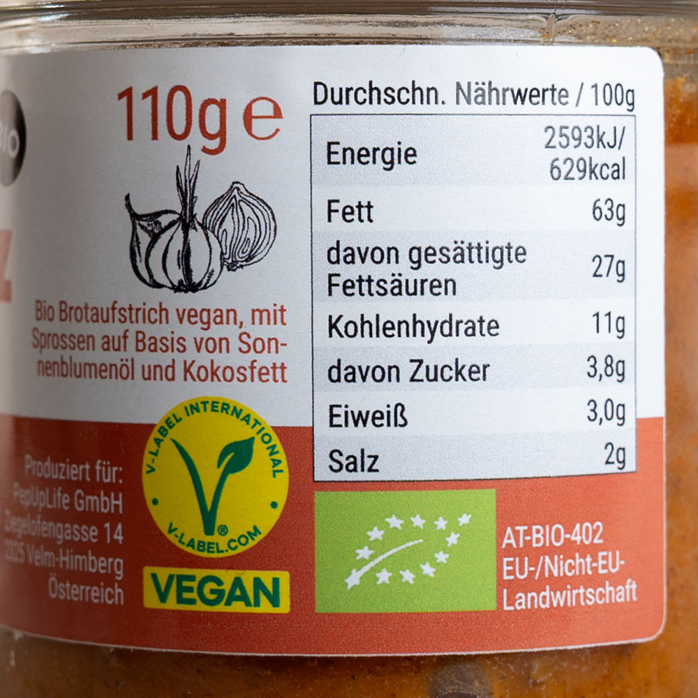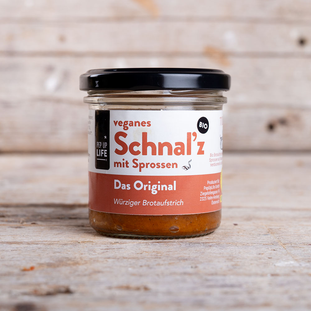 Der Aufstrich Schnal'z mit Sprossen Original ist würzig und deftig. Er wird in Österreich hergestellt und passt perfekt aufs Brot oder zu Gebäck.