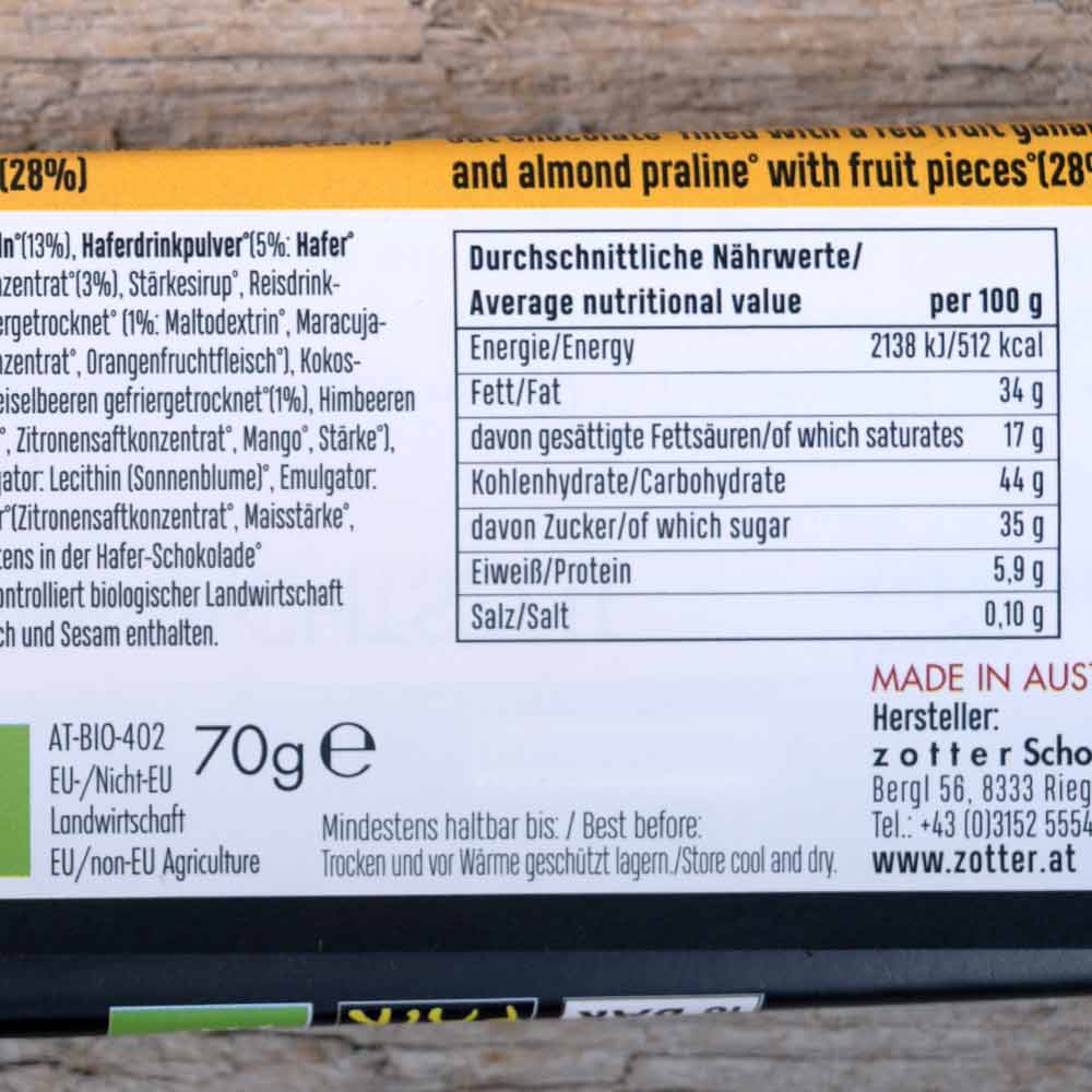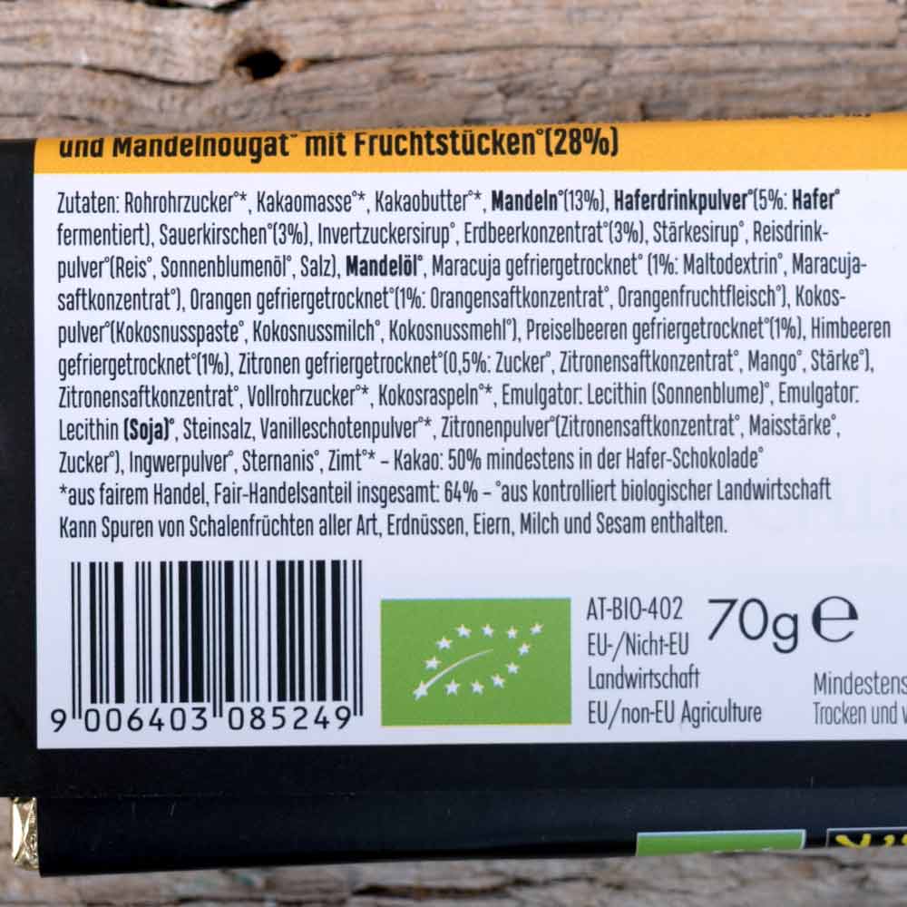 Der Schoko Weihnachtszeit kombiniert eine Haferschokolade mit einer Fruchtschicht aus verschiedenen Beeren und einen Hauch frischer Zitrone.