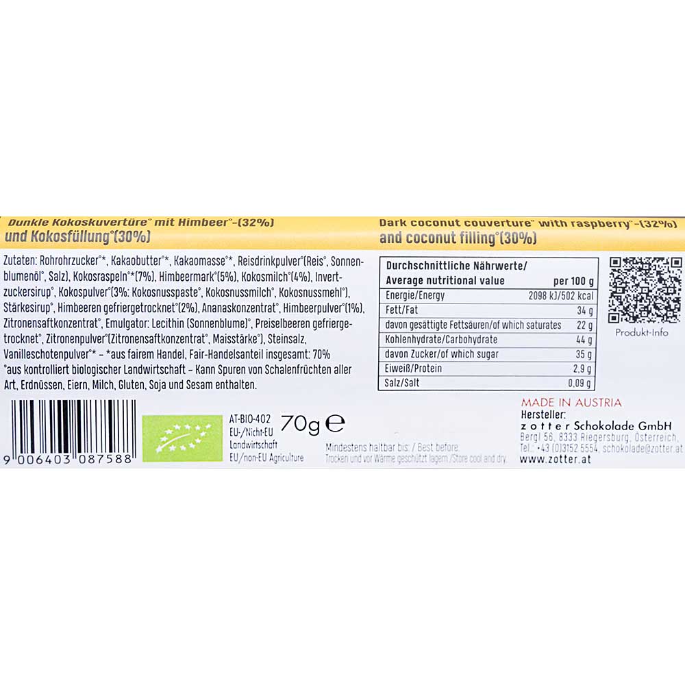 Kakaomasse*, MARZIPAN* (MANDELN*, Zucker*, Invertzuckersirup*), Rohrohrzucker*, Kokosraspeln*, Kakaobutter*, Reisdrinkpulver* (Reis*, Sonnenblumenöl*, Salz), Kokosblütenzucker*, Kokosnussöl*, Reissirup*, Vanilleschotenpulver*, Steinsalz, Emulgator: SOJALECITHIN*