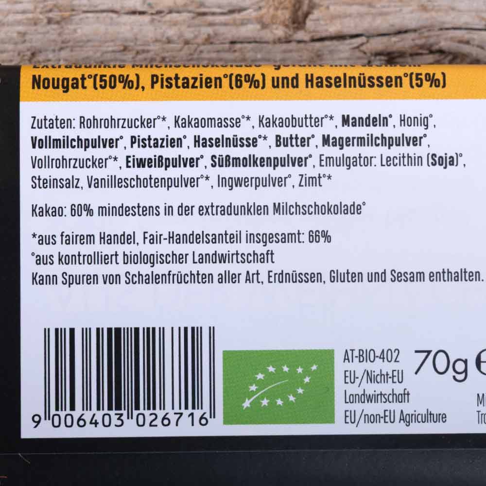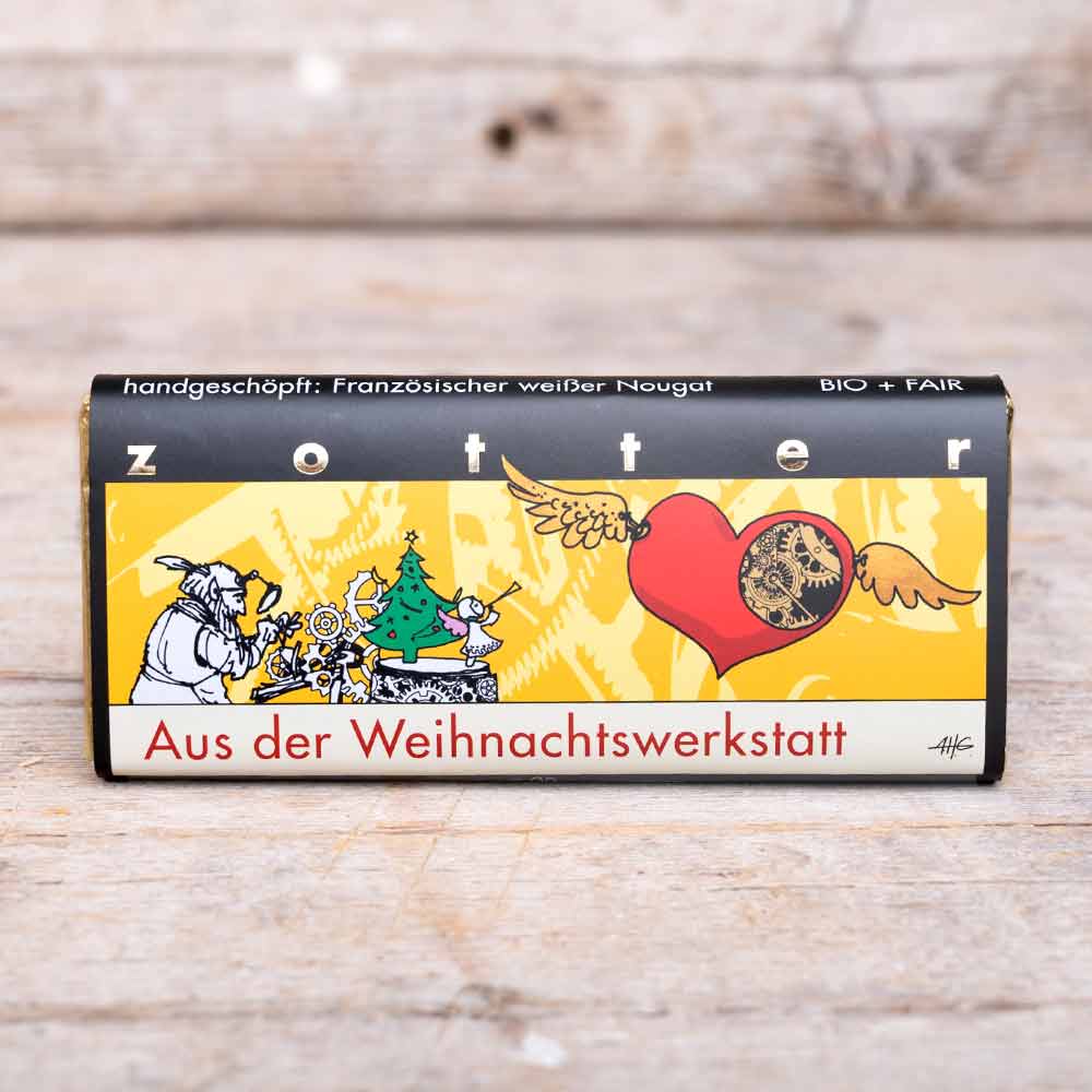 Der Schoko aus der Weihnachtswerkstatt ist gefüllt mit weißem Nougat, Pistazien und Haselnüssen - umhüllt mit Milchschokoladenüberzug.