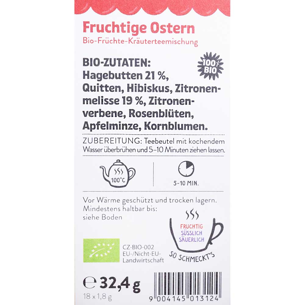 Der Tee Fruchtige Ostern mit Hagebutte, Quitte und Hibiskus sorgt für gemütliche Stunden beim Osterfest. Er schmeckt auch kalt als Eistee.